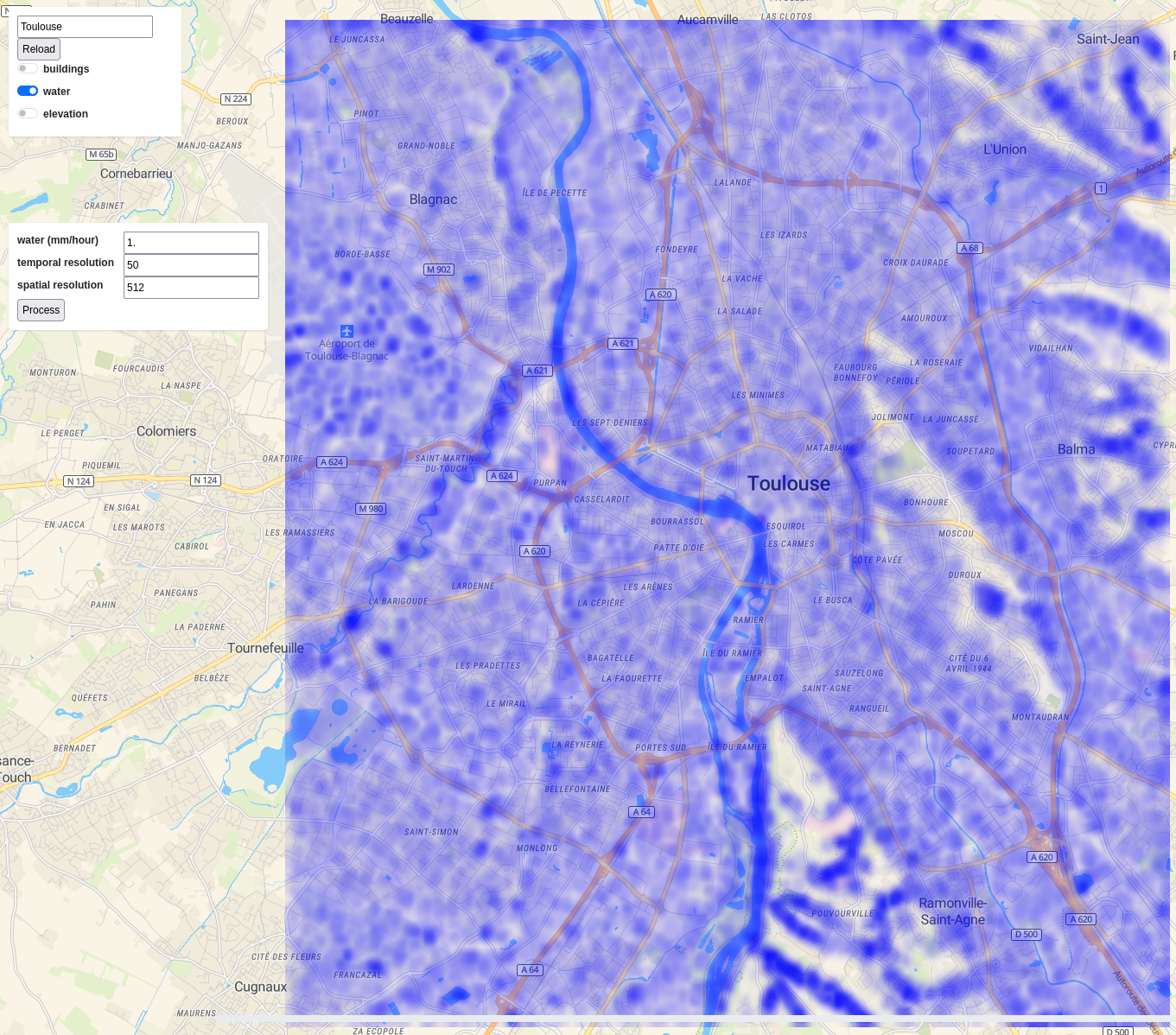 Le front-end est une interface utilisateur qui affiche une carte géographique avec une heatmap transparente représentant la quantité d’eau en surface au cours du temps. Cette interface permet aux utilisateurs de visualiser facilement les écoulements et d’identifier les zones à risque. Nous avons utilisé OpenMap Box pour créer une carte interactive où les utilisateurs peuvent zoomer, dézoomer et se déplacer pour visualiser les zones d’intérêt.